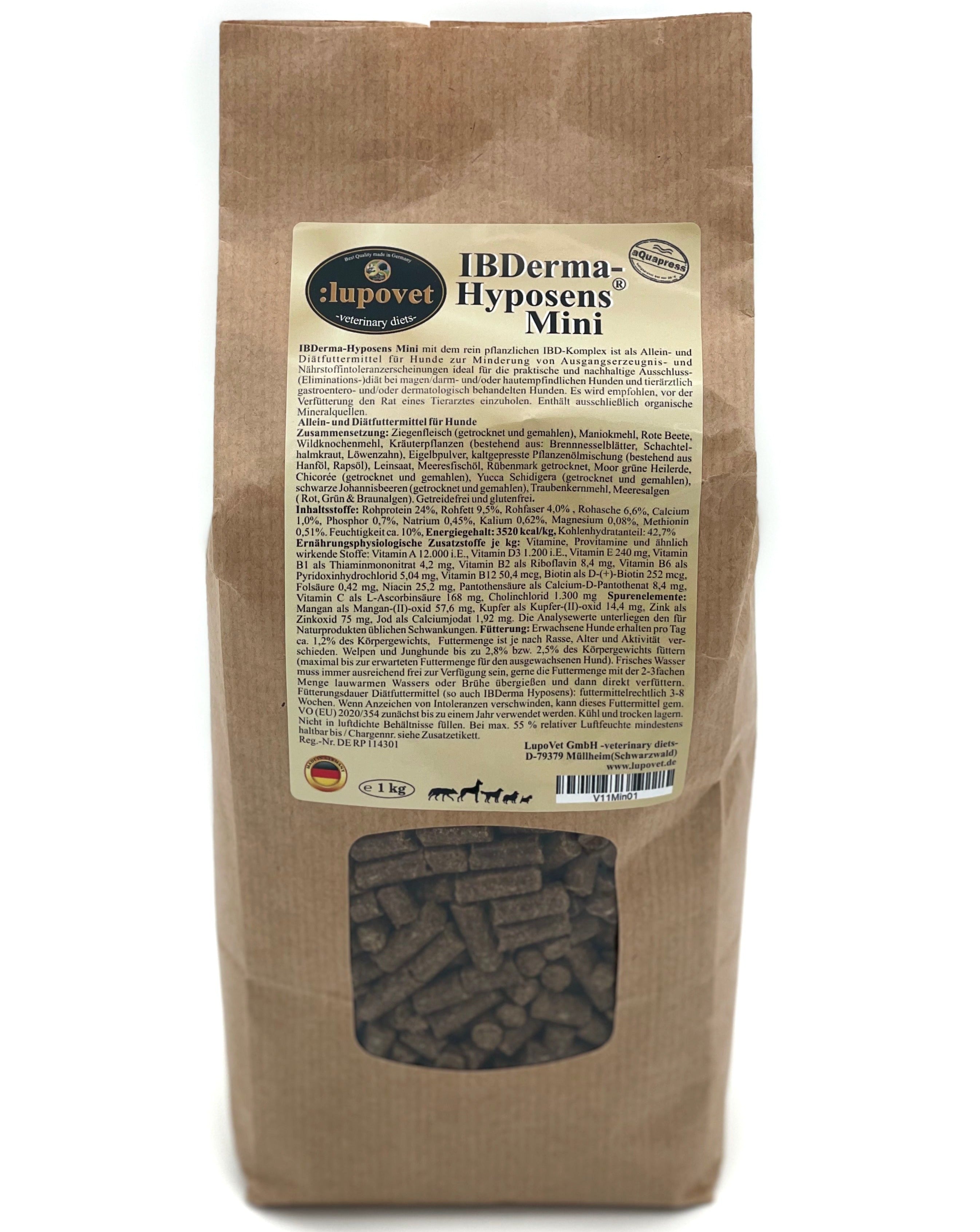 LupoVet IBDerma-Hyposens Mini ist als Allein- und Diätfuttermittel für Hunde zur Minderung von Ausgangserzeugnis- und Nährstoffintoleranzerscheinungen ideal geeignet für die Ausschlussdiät bei Futtermittelallergie und Magen-Darm-empfindlichen Hunden.