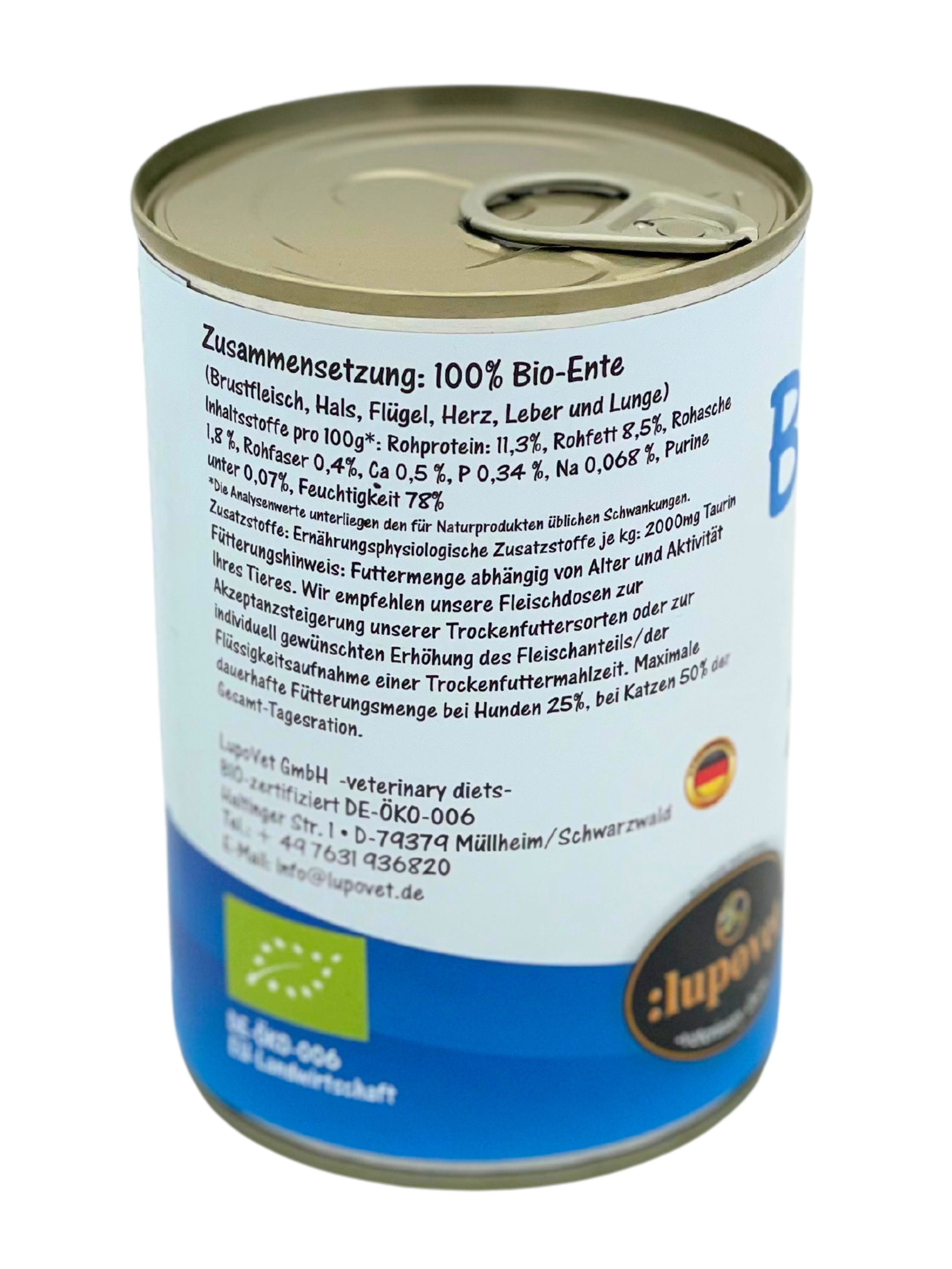 BIO-ENTE ist als Einzelfuttermittel für Hunde und Katzen garantiert aus schlachtfrischem Fleisch von höchster Bio-Qualität ausschließlich von Tieren, die für die Gewinnung von Lebensmitteln bestimmt waren. Enthält native, lebenswichtige Vitamine, Mineralien- und Spurenelemente. Kaltabfüllung zum bestmöglichen Nährstofferhalt. Garantiert OHNE Tier- und Knochenmehle, Konservierungs- und Farbstoffe oder chemische Zusätze wie nierengefährdende, nicht deklararationspflichtige Phosphatbinder.
