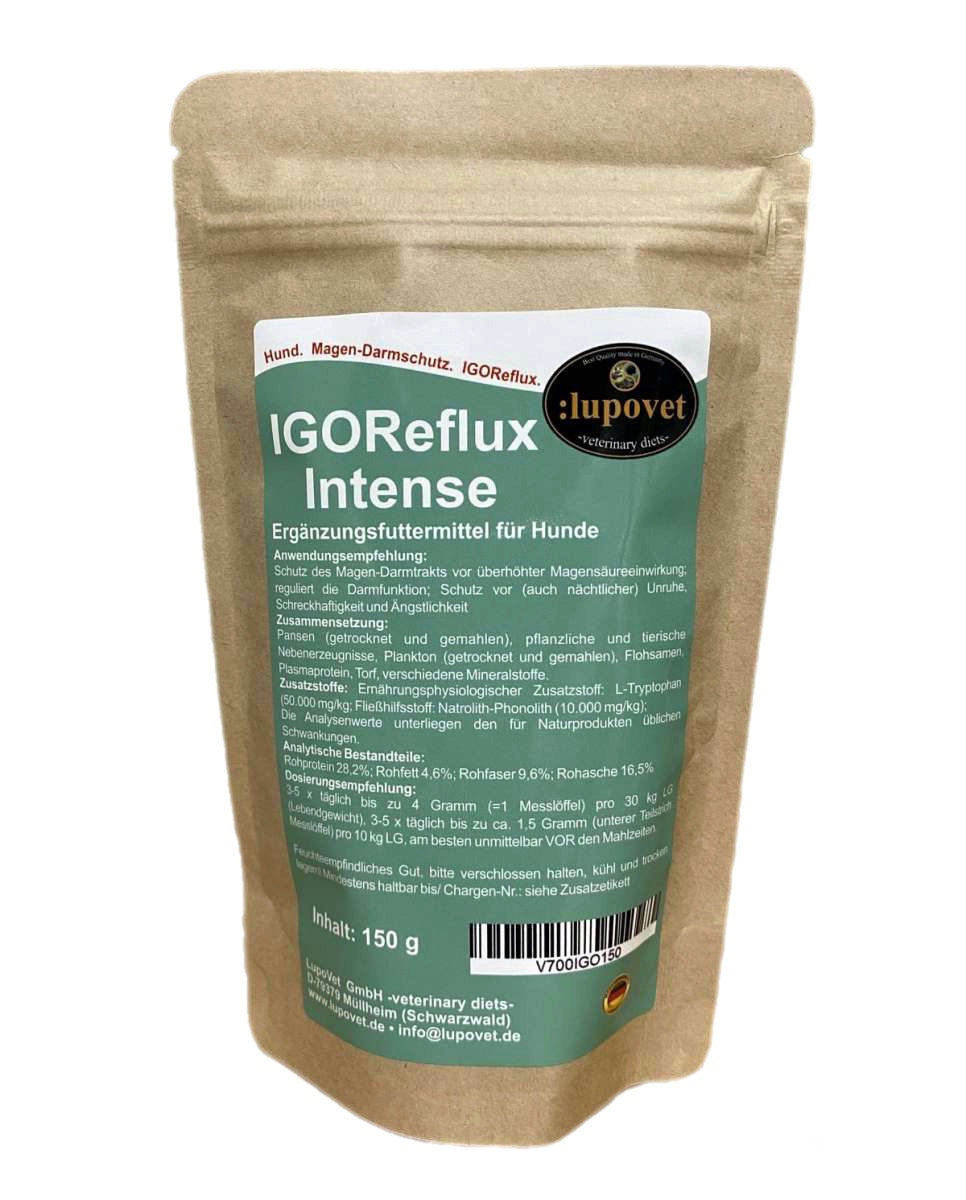 IGOR steht für Inflammatory Gastro Oesophageal Reflux – also Sodbrennen beim Hund. Die perfekte Basis zum diätetischen Schutz der Speiseröhre und des Magens bei Hunden gegenüber Reizungen ist IBDerma-HyposensDieses Futter lässt sich perfekt mit IGOReflux kombinieren und wird speziell für Hunde mit empfindlicher Verdauung und chronischen Magen-Darm-Problemen hergestellt.