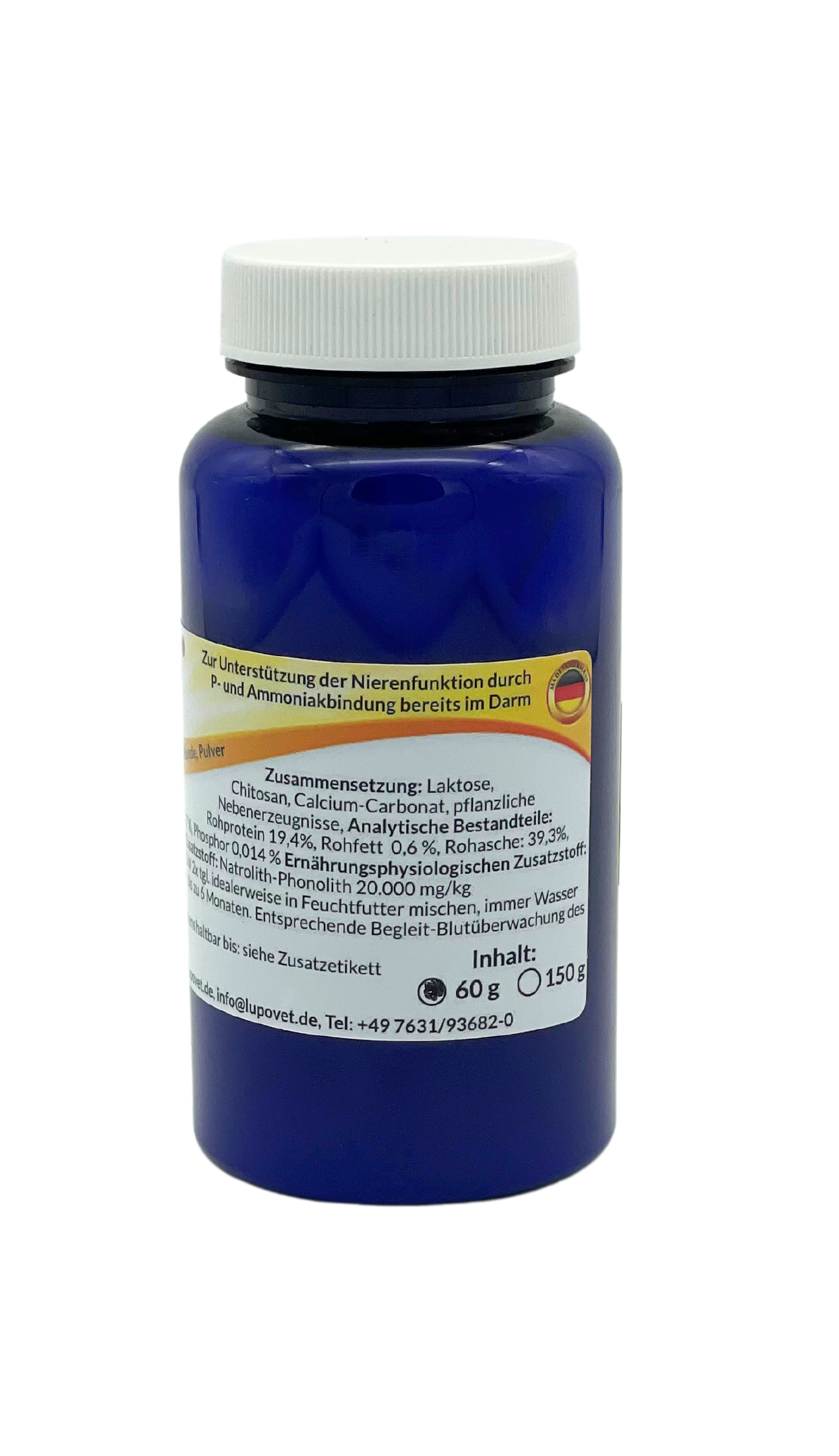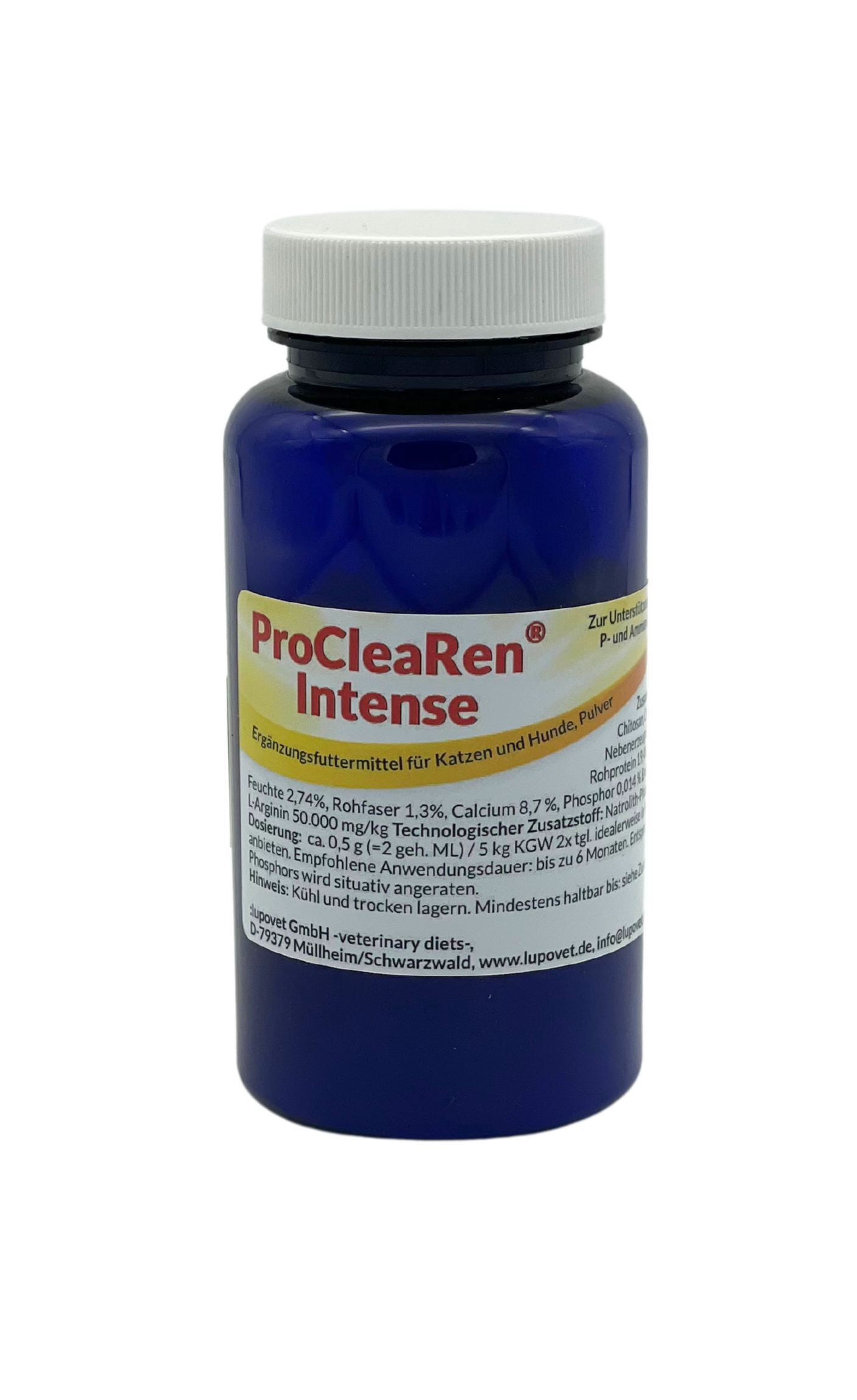 Viele Haustiere und insbesondere ältere Katzen leiden immer öfter an einer Chronischen Nieren-Insuffizienz (CNI). ProCleaRen Intense Pulver folgt den jüngsten Empfehlungen aus der Forschung und bindet Phosphat und Ammoniak bereits im Darm zu nicht resorbierbaren Molekülen, sodass es für den Stoffwechsel nicht zur Verfügung steht und die Nierenfunktion somit unterstützt bzw. entlastet.